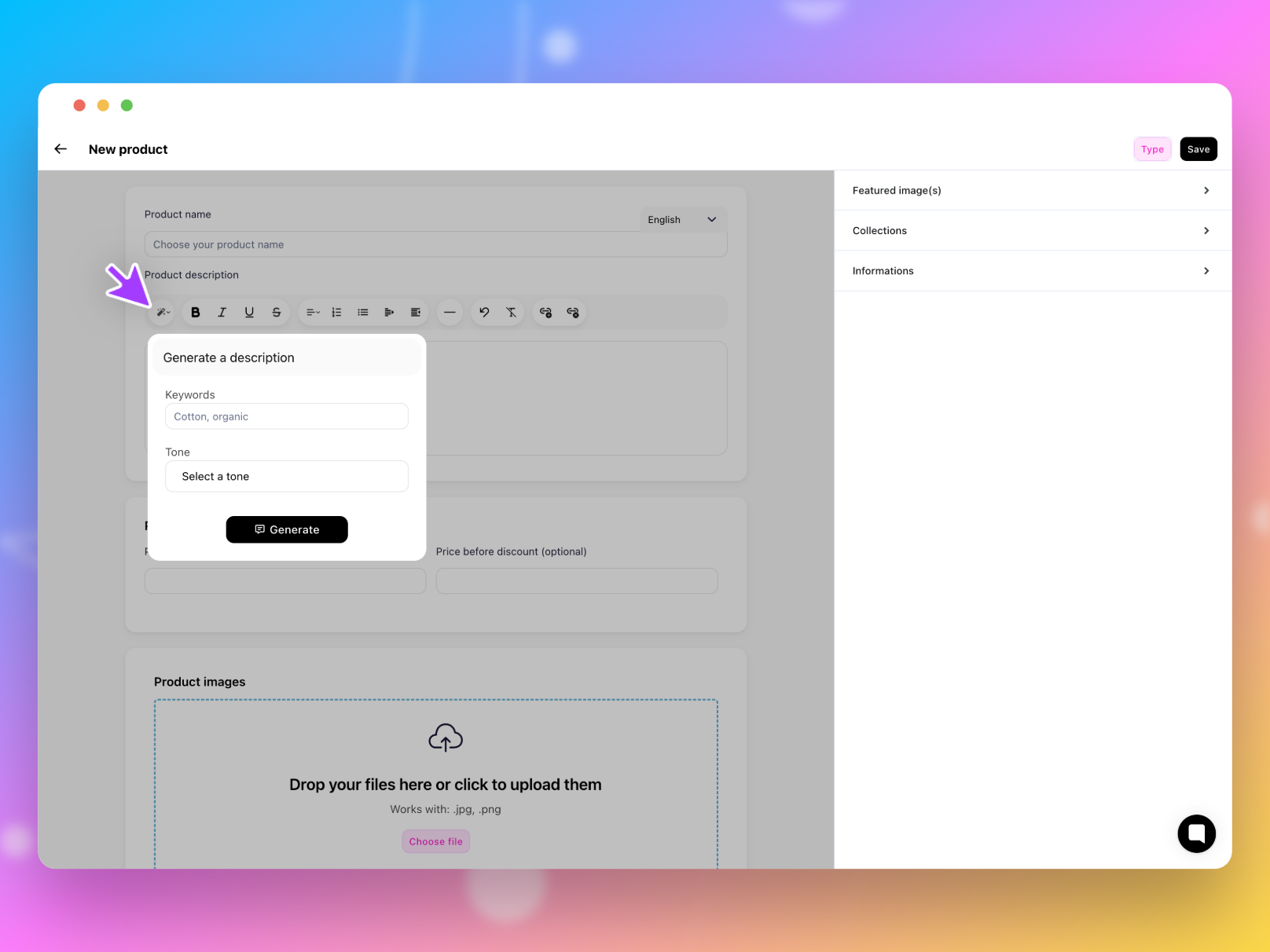 Maintenant, grâce à notre outil d'IA intégré à notre éditeur de texte, nous vous facilitons la tâche et vous pourrez ainsi générer des descriptions originales. Cliquez simplement sur la petite baguette magique.