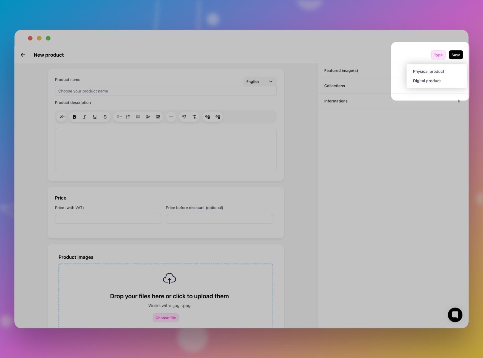 Vous avez la possibilité d'ajouter des produits numériques ou physiques. Il vous suffira de sélectionner en haut à droite le « type de produit » afin de pouvoir renseigner correctement les informations de votre article.
