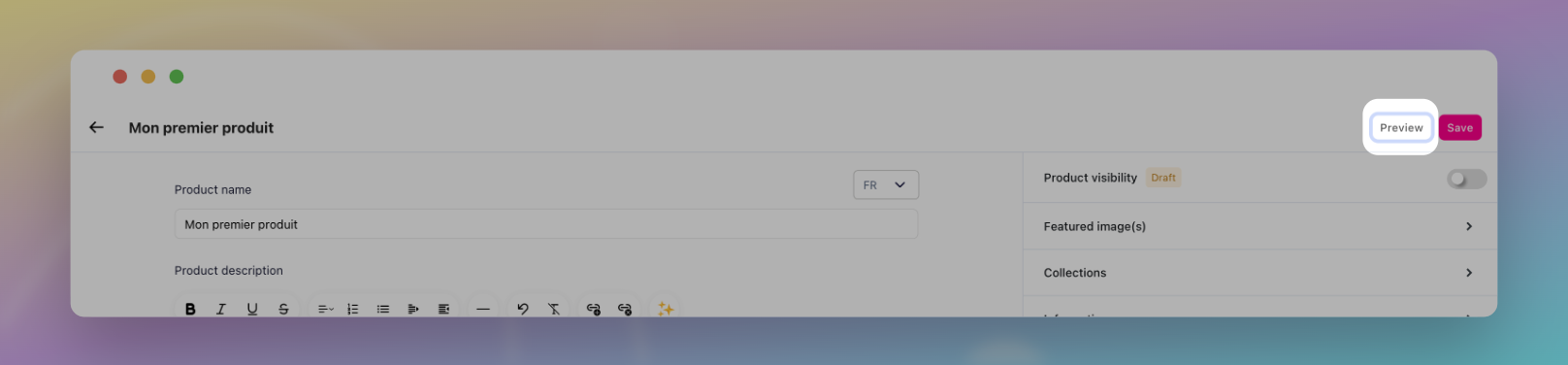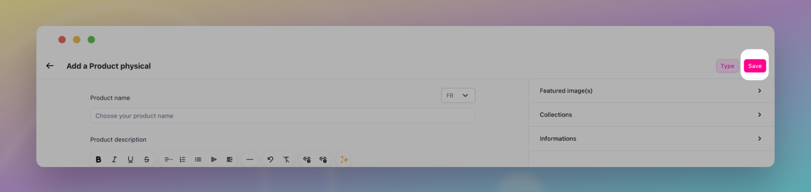 Une fois que vous avez rempli tous les champs nécessaires, il vous suffit de cliquer sur le bouton « Enregistrer » situé en haut à droite de la page pour finaliser la création de votre produit.