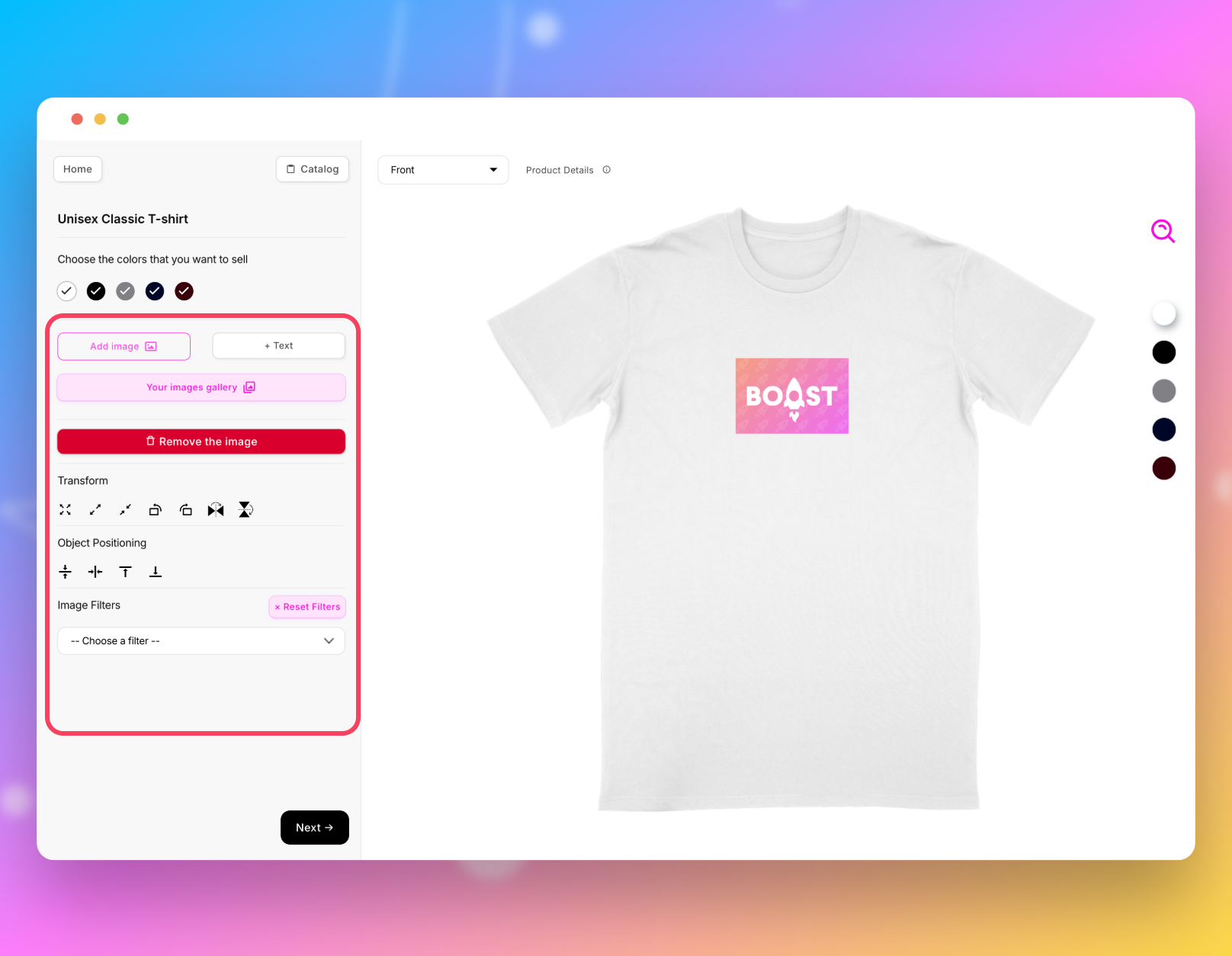 Une fois votre produit sélectionné, il vous suffit d'ajouter un visuel en cliquant sur « Image » ou d'ajouter du texte en cliquant sur « texte ».