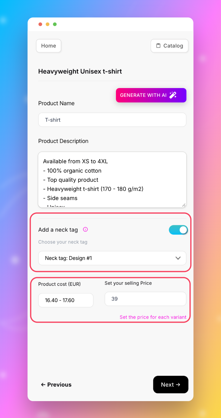 Dans l’étape suivante, vous pourrez saisir le nom de votre produit, son prix mais aussi activer l'option « marquage col ». Il vous suffira de cliquer sur le bouton correspondant. Assurez-vous d'abord de télécharger votre visuel de col dans les options de production pour que cette option soit disponible (celle-ci se trouve dans les réglages POD).