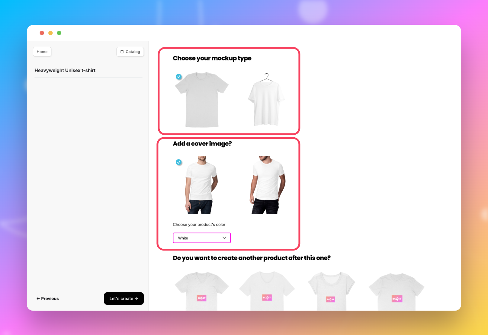 Ensuite, vous pourrez choisir l'image mise en avant, sélectionner le type de mannequin (femme/homme par exemple), choisir entre la face ou le dos du produit si vous avez opté pour une impression recto/verso, ainsi que définir la couleur du produit.