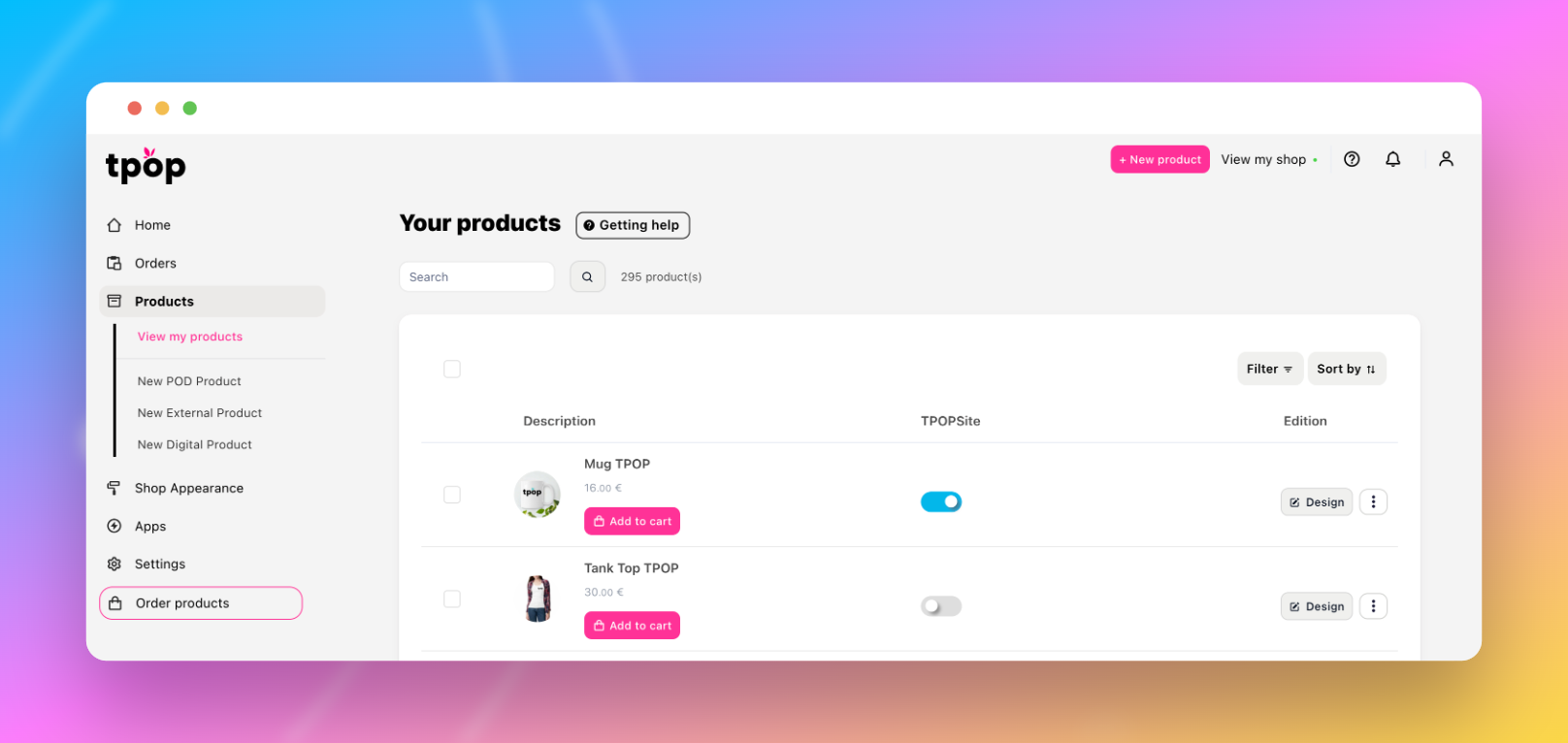De superbes visuels que vous pourrez pousser en même temps que votre produit sur votre boutique via l’interface sur laquelle vous serez redirigé. Il vous sera aussi possible de modifier votre design en cliquant sur "Design", de l'éditer en cliquant sur les trois petits points se trouvant tout à droite du produit. Grâce à ce bouton, vous pourrez aussi dupliquer, fusionner ou supprimer votre produit TPOP.