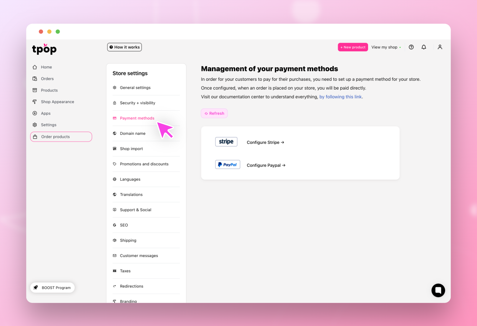 La première étape consiste simplement à vous rendre dans votre interface afin d’initier la configuration en vous rendant dans les réglages Boutique, puis dans Méthodes de paiement.