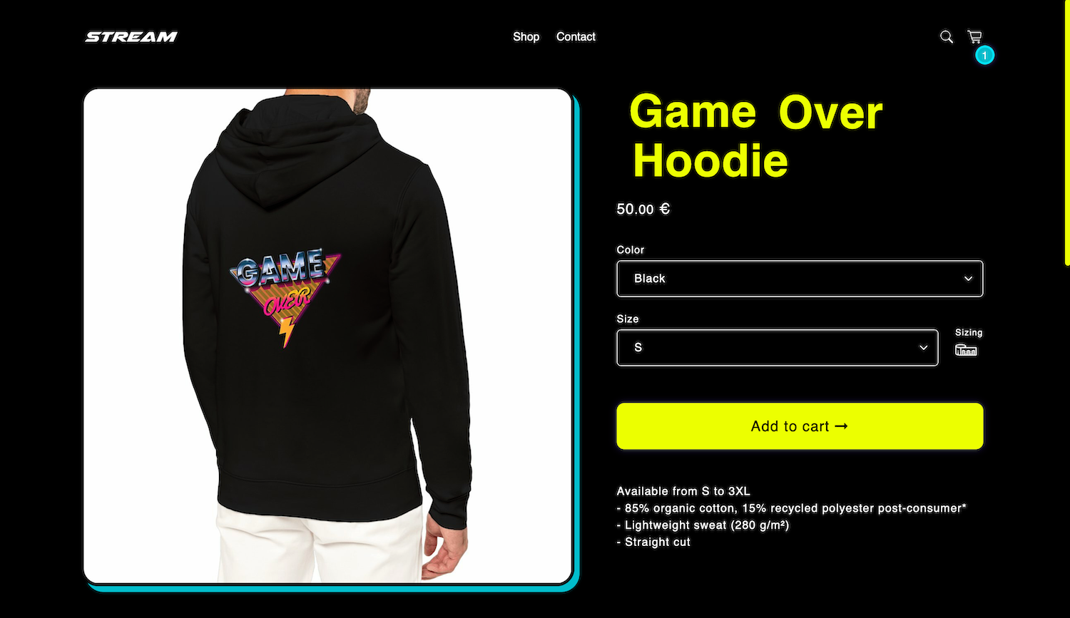 La fiche produit de STREAM mise sur un contraste fort et une présentation visuelle dynamique. Le visuel est parfaitement mis en avant à gauche, tandis que le panneau de droite présente les options d’achat avec une grande lisibilité.