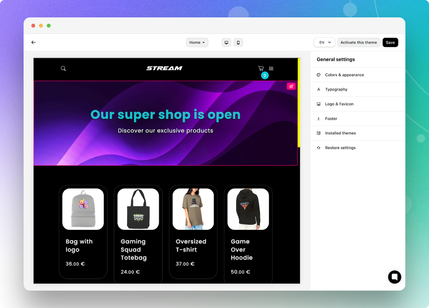 Bien qu’ils soient conçus pour une mise en ligne rapide, les thèmes SUNRISE et STREAM offrent une personnalisation complète. Vous pouvez facilement adapter l’apparence de votre boutique à votre image de marque, sans compétences techniques. Rendez-vous dans la section de l'apparence de votre boutique, puis "Thèmes".