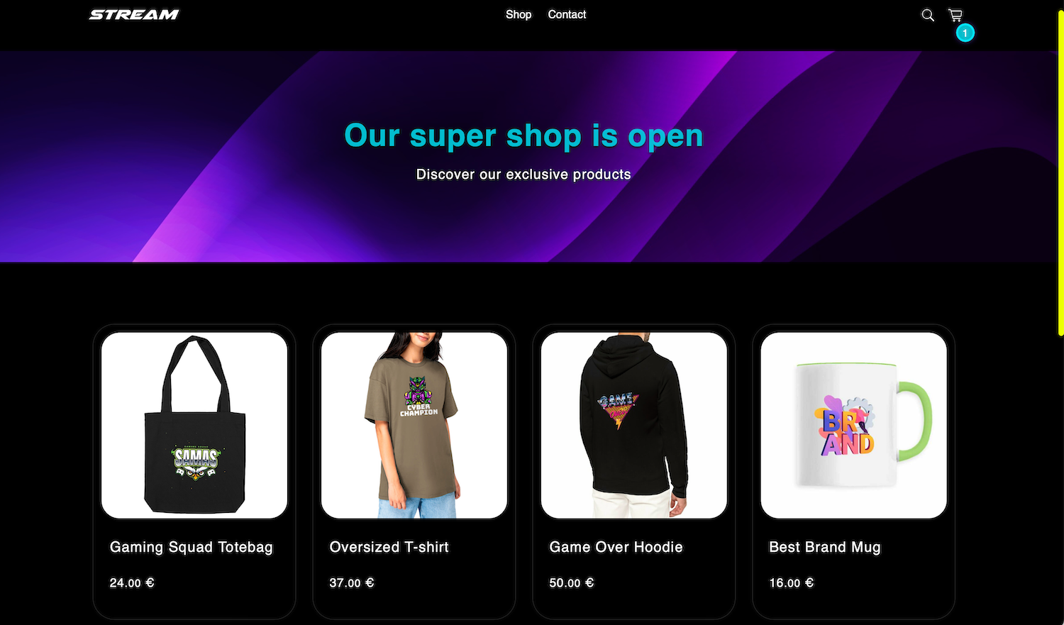 Le thème STREAM séduit par son design dark moderne et son impact visuel immédiat. Dès l’arrivée sur la boutique, vos produits sont visibles, parfaitement mis en valeur sur un fond noir profond qui renforce la lisibilité et l’élégance.