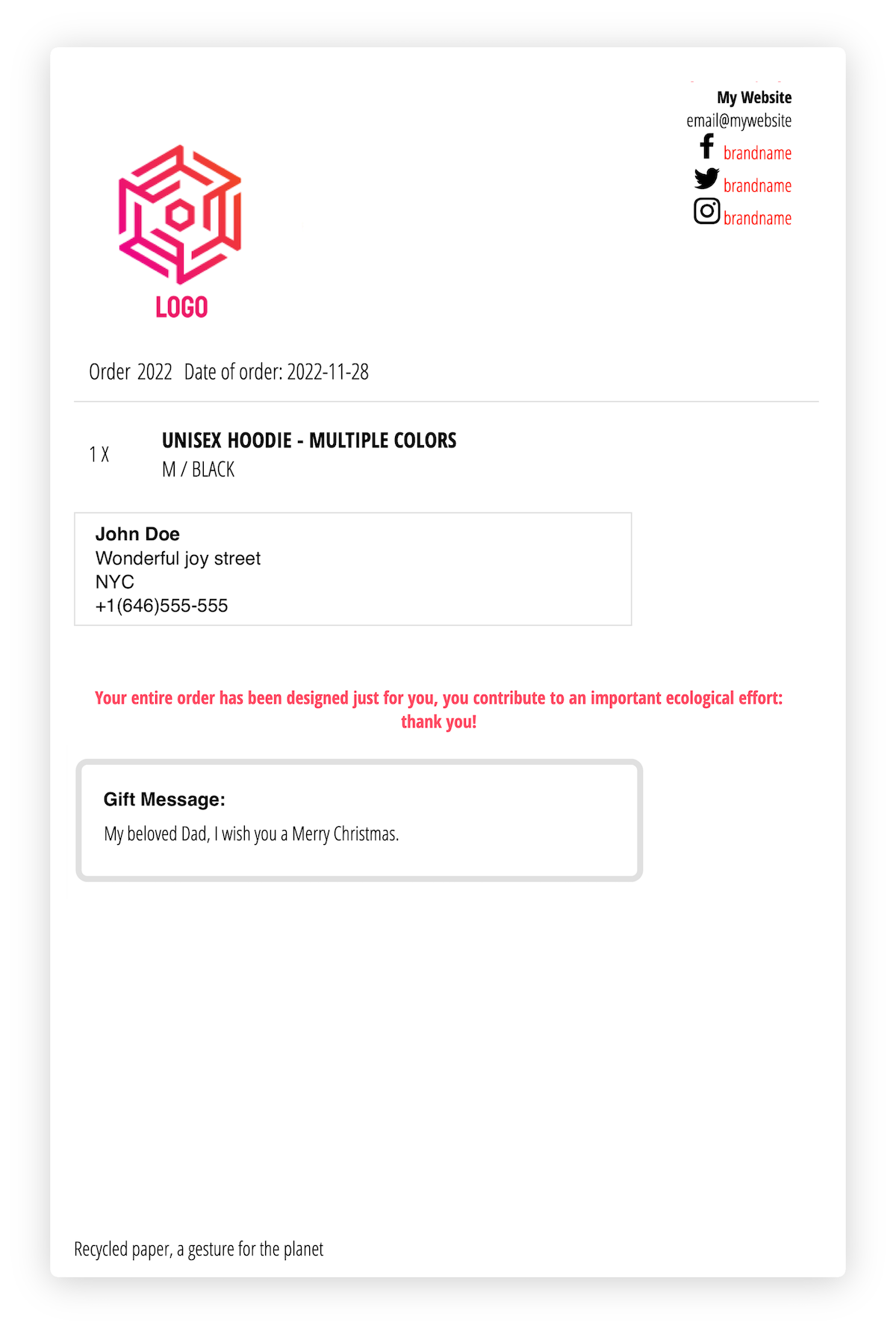Hop, le message apparaitra alors sur le bordereau de livraison - le document inséré dans chacune de vos commandes - le client final aura la chance d'avoir un colis de la part de Mamie, Papa ou encore d'oncle Georges avec un petit mot sympathique au pied du sapin.