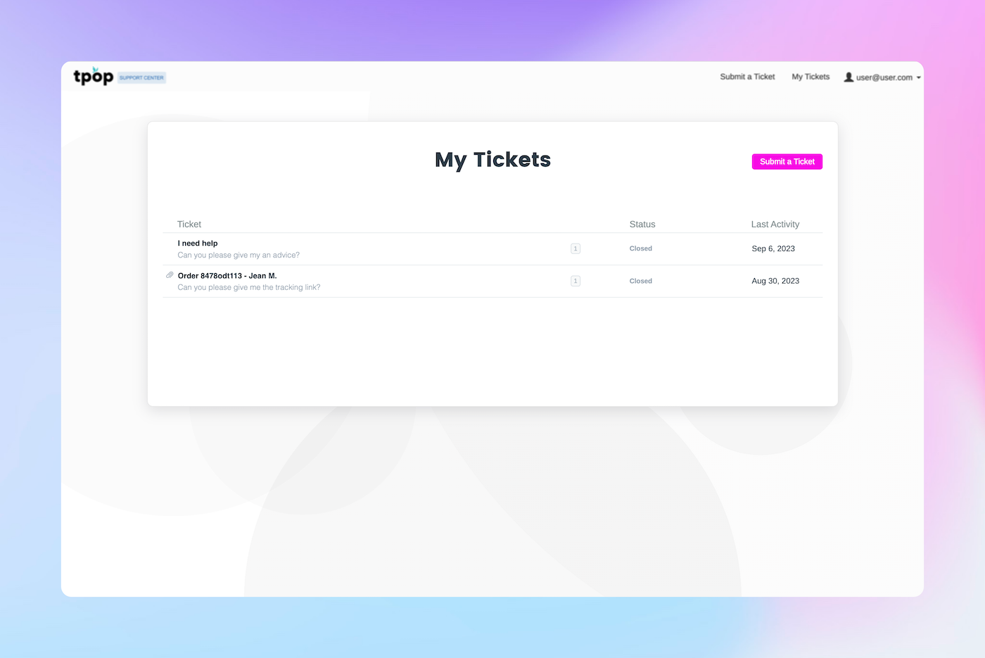 Ouvrez simplement la bulle de support, vous verrez apparaitre (si vous avez déjà contacté le support TPOP) un bouton "Mes tickets".